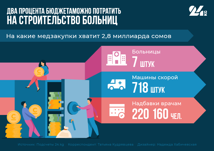 В начале октября Минздрав объявил, что собирается закупить 43 автомобиля скорой медицинской помощи. На это министерство заложило 167 миллионов 700 тысяч сомов. В стоимость входит и медицинское оборудование. Получается, один автомобиль обходится в 3,9 миллиона сомов. На те средства, что из бюджета уйдут в фонд президента, можно купить 718 новых автомобилей.