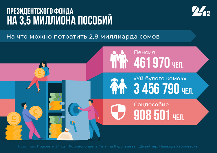 После повышения с 1 октября 2020 года средний размер пенсии в Кыргызстане достиг 6 тысяч 61 сома. По предварительным расчетам Социального фонда, число пенсионеров на 1 октября 2021 года составит 715,5 тысячи человек. Получается, денег из президентского фонда хватит на выплату такой пенсии двум из пяти пожилых.
