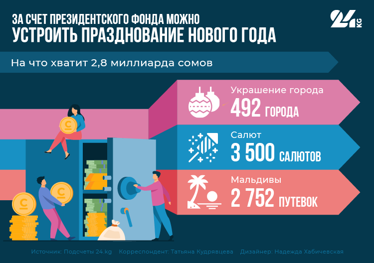 Например, на украшение площади Ала-Тоо и елки мэрия Бишкека потратила более 5,6 миллиона сомов. За счет средств фонда президента можно украсить почти 500 населенных пунктов.