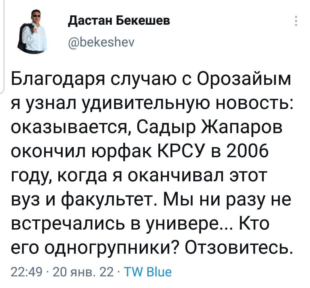 Депутат Жогорку Кенеша Дастан Бекешев призвал откликнуться одногруппников Садыра Жапарова. Он пояснил, что тоже учился на юрфаке этого вуза и, как Садыр Жапаров, окончил университет в 2006 году.