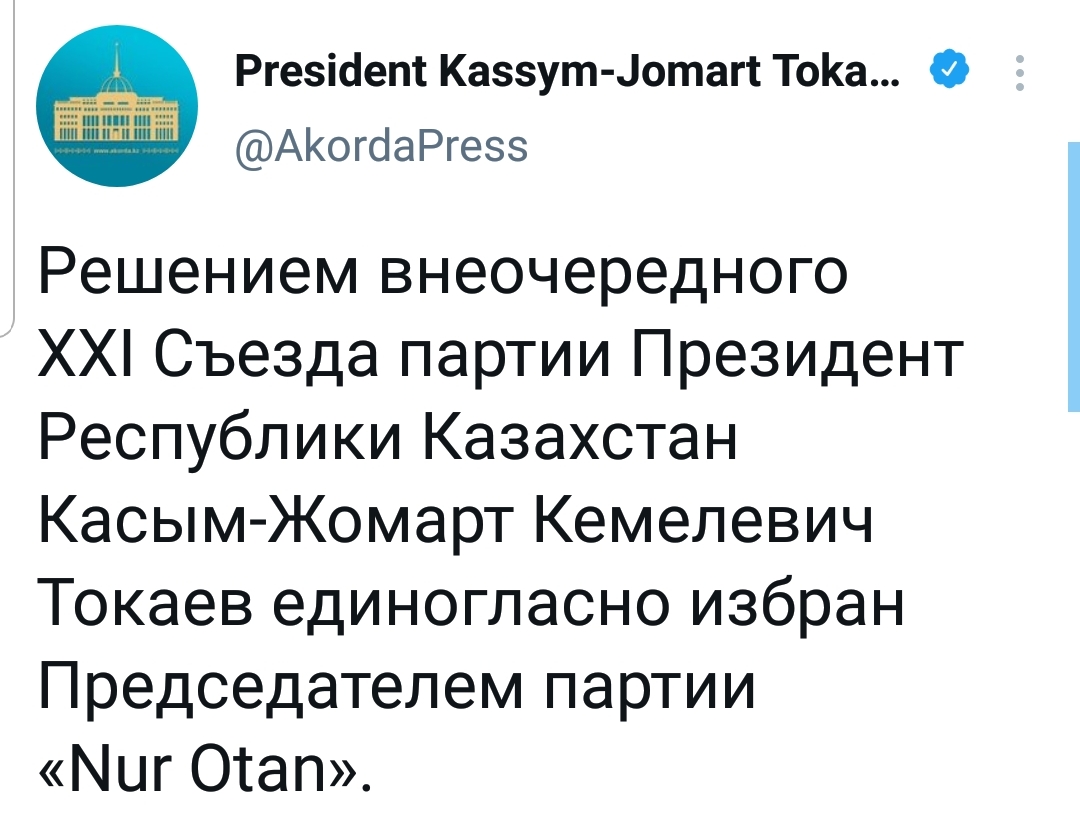 Как пишет Акорда, предложение об избрании Токаева председателем партии внес бывший президент Казахстана Нурсултан Назарбаев. Делегаты съезда поддержали это предложение единогласно.
