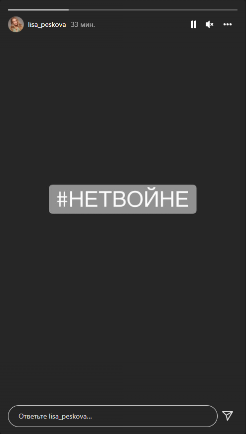 Дочь пресс-секретаря президента России Елизавета Пескова опубликовала в своем Instagram сториз со словами «Нет войне».
