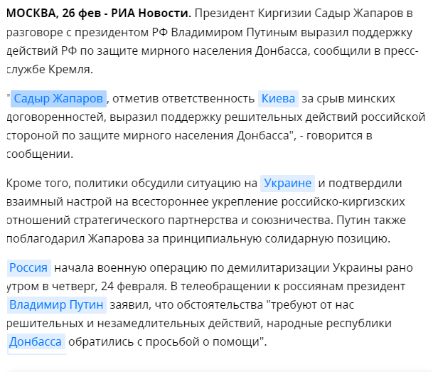 РИА Новости сообщило, что в телефонном разговоре президент Кыргызстана Садыр Жапаров «выразил поддержку действиям России по защите мирного населения Донбасса».