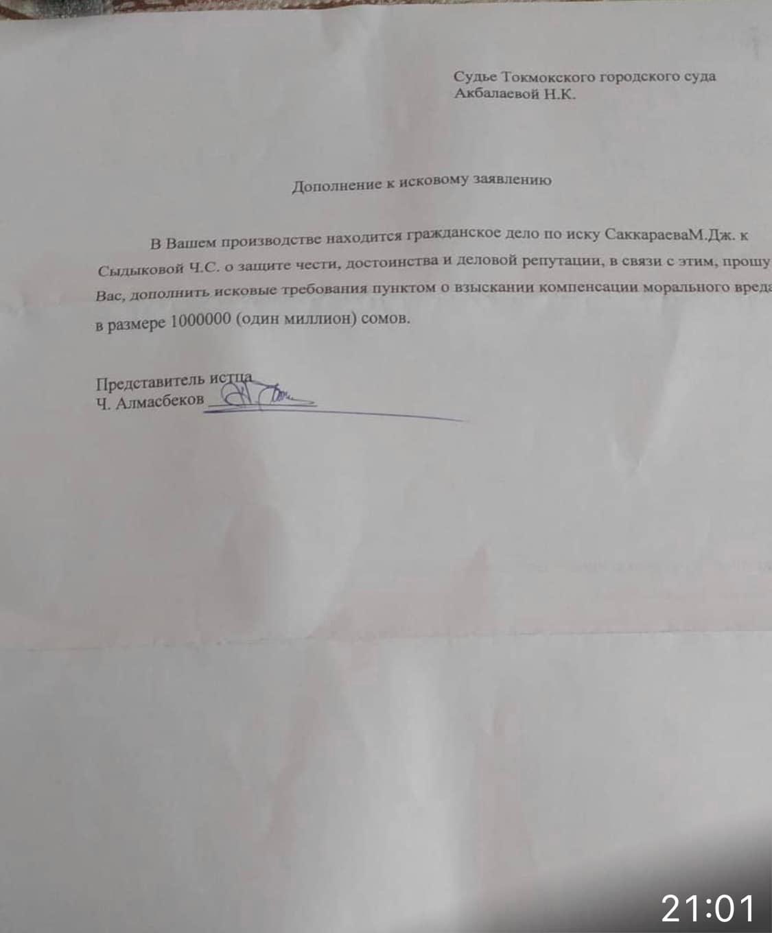Парламентарий Медербек Саккараев подал в суд на депутата Токмакского горкенеша Чолпон Сыдыкову. Об этом она сообщила в Facebook.