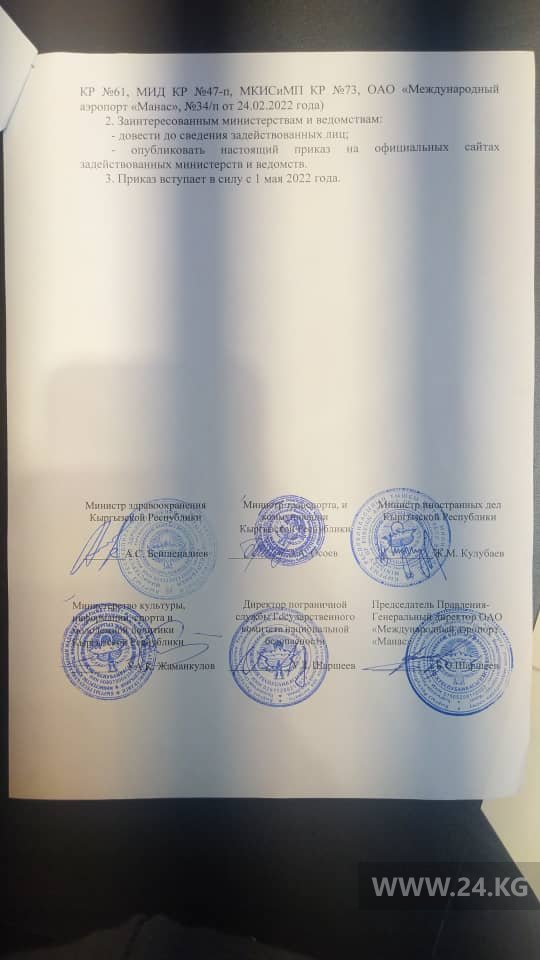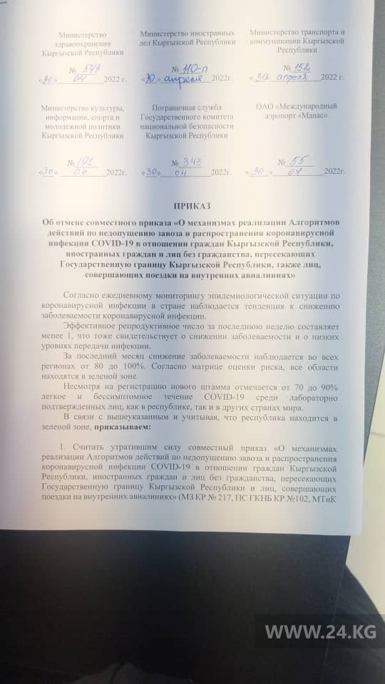С 24.00 сегодня отменяется проверка ПЦР-тестов и сертификатов о вакцинации на границе. Об этом 24-kg.com сообщил заместитель председателя кабинета министров Эдиль Байсалов.