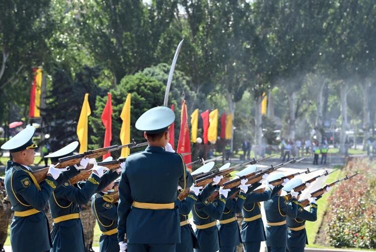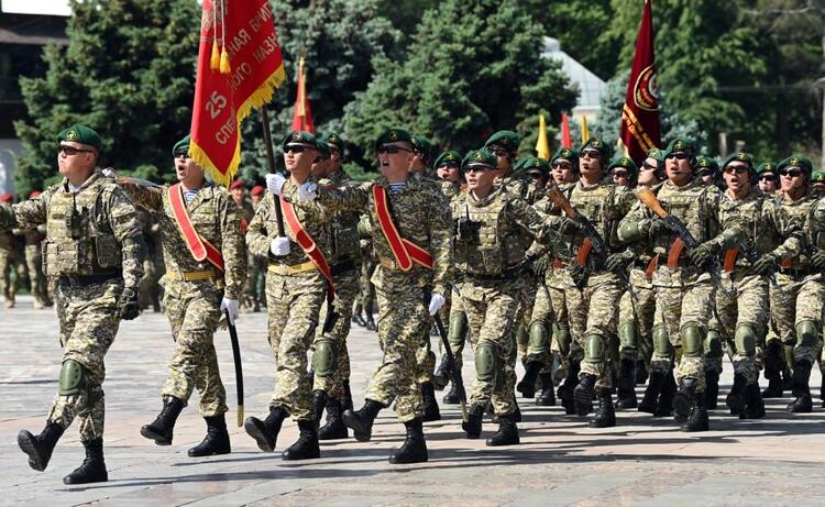 На площади Победы состоялось торжественное прохождение маршем личного состава войск Бишкекского гарнизона.