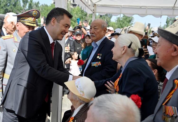 Поздравить ветеранов ВОВ и тружеников тыла пришел президент Садыр Жапаров. Он вместе с другими официальными лицами возложил цветы к Вечному огню и почтил память погибших в Великой Отечественной войне минутой молчания.