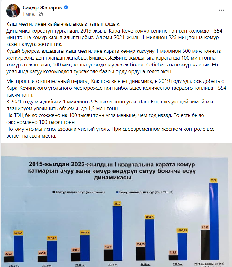«Как показывает динамика, в 2019 году удалось добыть с Кара-Кечинского угольного месторождения наибольшее количество твердого топлива — 554 тысячи тонн (до 2020-го). В 2021 году мы добыли 1 миллион 225 тысяч тонн угля. Даст бог, следующей зимой мы планируем увеличить объемы до 1,5 миллиона тонн», — написал глава государства.