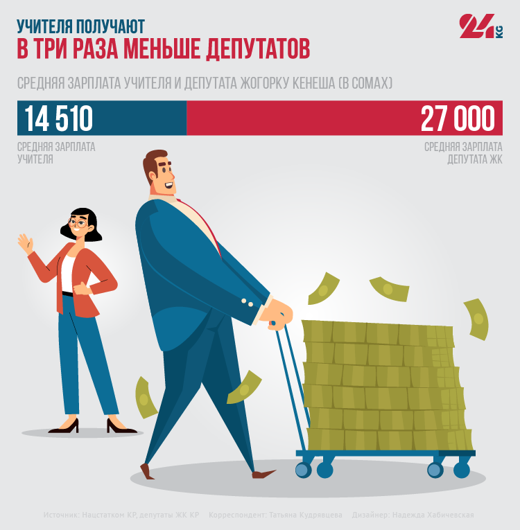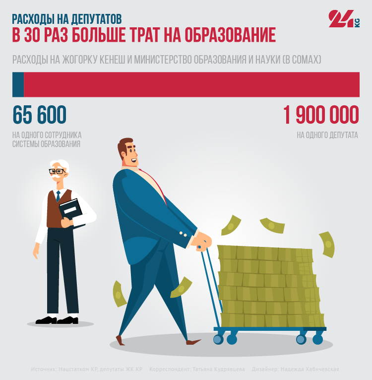 Получается, на одного парламентария потратили 599 тысяч сомов, сотрудника системы образования — 20 тысяч 812 сомов. Даже если поделить расходы на выплату зарплаты только учителям, то сумма хоть и получается приличная, но все равно меньше трат на парламентариев — 44,7 тысячи сомов.