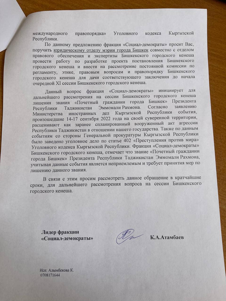 В Бишкекском городском кенеше депутаты фракции «Социал-демократы Кыргызстана» приняли решение инициировать создание правового механизма для лишения президента Таджикистана Эмомали Рахмона звания почетного гражданина столицы Кыргызстана. Об этом сообщил депутат БГК Кадыр Атамбаев.