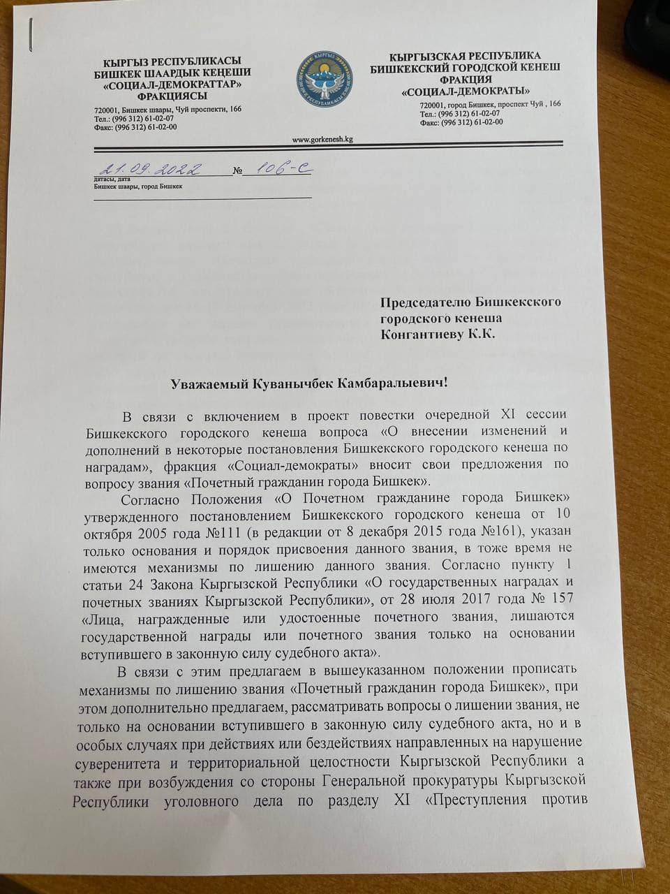 Ранее член Жогорку Кенеша Дастан Бекешев направил мэру Бишкека и БГК официальное письмо с просьбой отменить решение о присвоении этого звания.