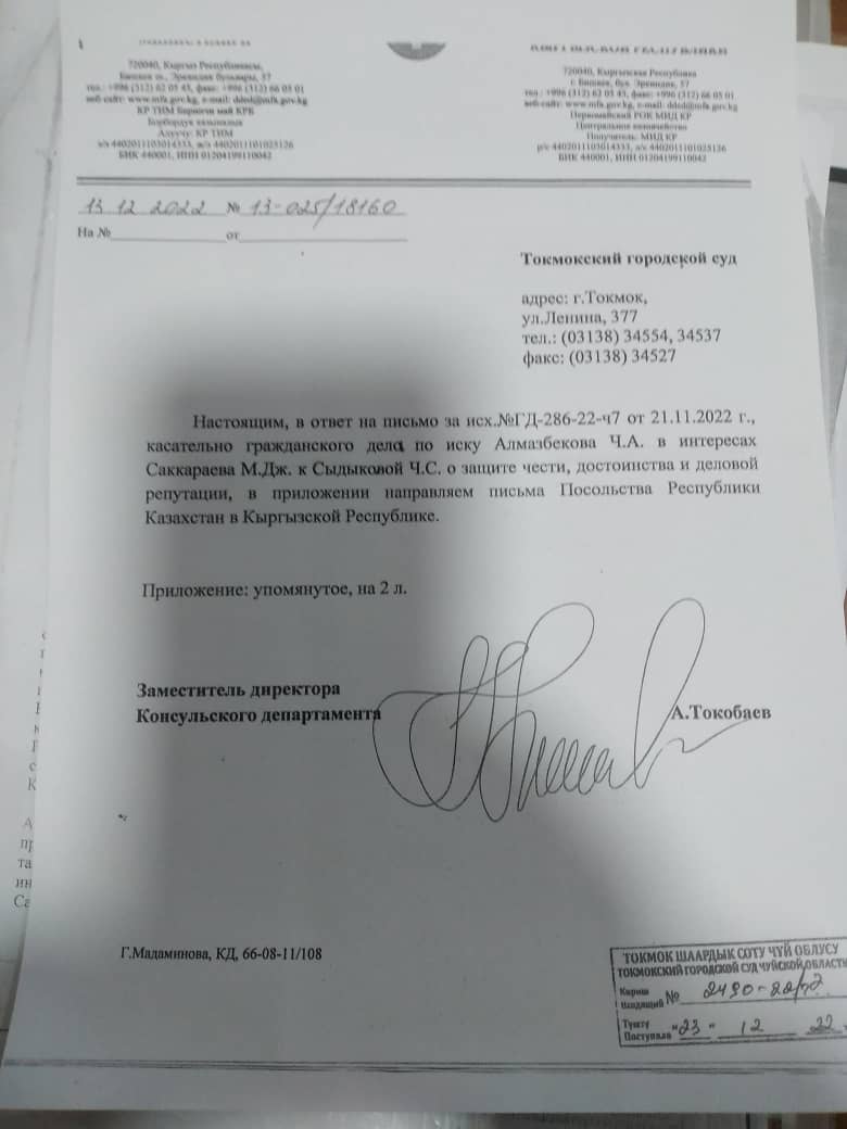 «В ответе дипмиссии соседней страны указывается, что Медербек Саккараев писал заявление о выходе из гражданства, документ зарегистрирован 18 ноября 2021-го. То есть на момент регистрации кандидатом в депутаты Жогорку Кенеша, 11 октября 2021 года, он являлся гражданином Казахстана. Он должен был указать это в документах. Медербек Саккараев умышленно скрыл свое двойное подданство. Он написал заявление о выходе из гражданства, когда я выложила документ о его двойном индигенате в социальных сетях. В 2012-м Медербек Саккараев являлся депутатом Токмакского городского кенеша, а в 2021 году он стал парламентарием. Получается, он незаконно получил мандат», — сказала Чолпон Сыдыкова.