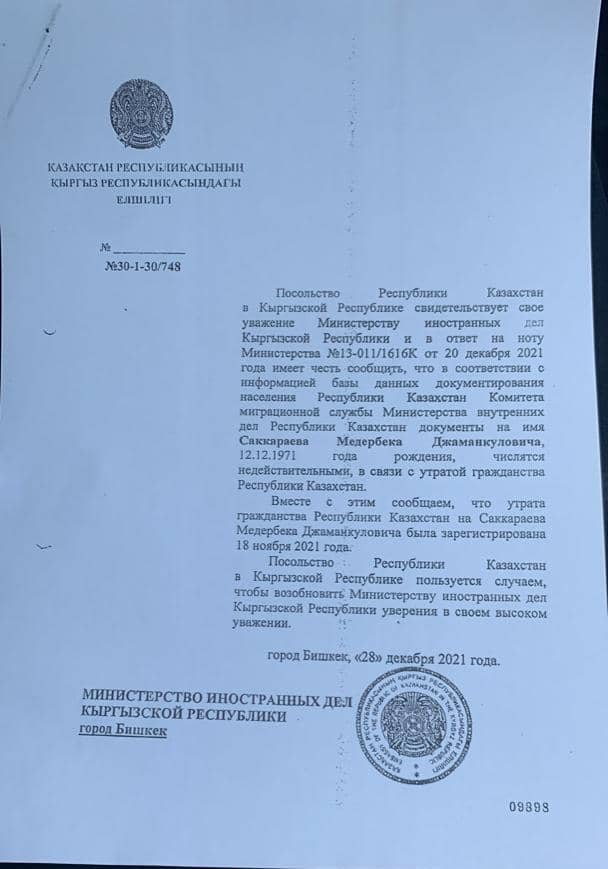 Напомним, до парламентских выборов в Facebook опубликовали документ якобы от управления миграционной службы Департамента полиции Алматы, в котором указано, что у Медербека Саккараева есть гражданство Казахстана, от которого он не отказался. 26 ноября 2021-го уполномоченный кандидата на заседании Центризбиркома сообщил, что Медербек Саккараев утратил гражданство РК и они запросили соответствующие документы из посольства соседнего государства. В апреле 2022 года парламентарий Медербек Саккараев подал в суд на депутата Токмакского горкенеша Чолпон Сыдыкову.