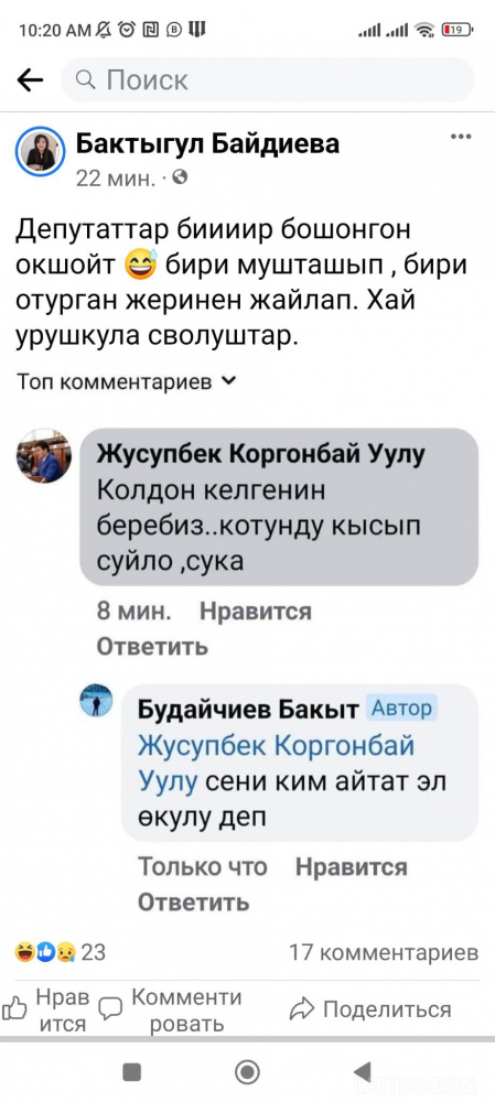 Пользователь Бакыт Будайчиев написал негативный комментарий под постом. Депутат ему ответил нецензурной бранью. Позже комментарий удалили.
