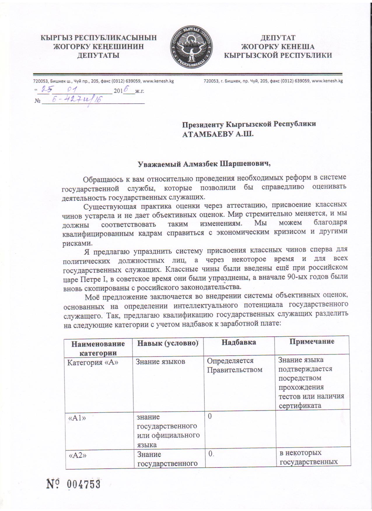 Как отмечается, предложение депутат направил и главе правительства Темиру Сариеву.