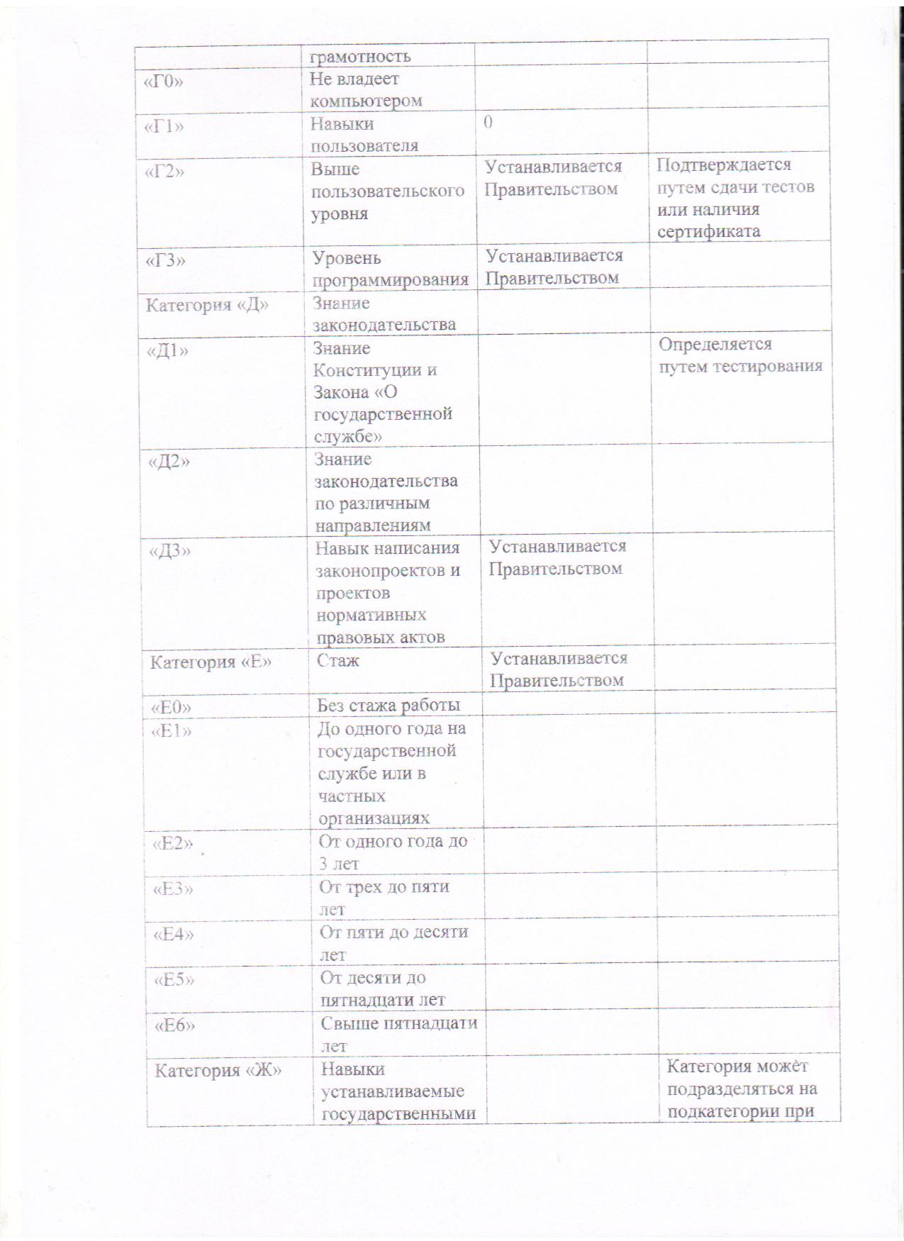 Депутат основательно подошел к проблеме, а потому приложил таблицу с условными категориями, по которым и предлагается аттестовывать (ежегодно!) всех служащих государственных и муниципальных органов. По мнению автора, необходимо учитывать знание языков (категория «А»), уровень образования (категория «Б»), ученую степень (категория «В»), компьютерную грамотность (категория «Г»), знание законодательства (категория «Д»), трудовой стаж (категория «Е»). Предлагается принимать во внимание «навыки, устанавливаемые государственными или муниципальными органами для конкретной должности» (категория «Ж») и «иные навыки: вождение, владение оружием и так далее» (категория «З»). Все категории (кроме двух последних) Дастан Бекешев предлагает подразделять на несколько степеней - в зависимости от уровня владения навыками (от нуля до 6, в зависимости от категории).
