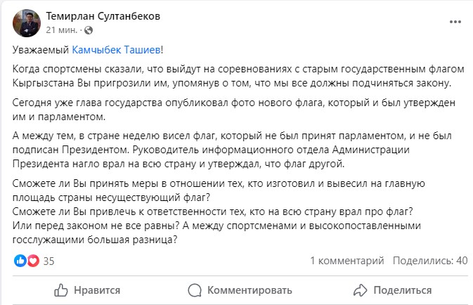 С обращением к главе ГКНБ Камчыбеку Ташиеву также выступил лидер партии «Социал-демократы» Темирлан Султанбеков на своей странице в Facebook. Он напомнил слова главы ГКНБ, когда спортсмены сказали, что будут выступать на соревнованиях со старым флагом. Тогда, напомним, Камчыбек Ташиев призвал всех соблюдать законы.