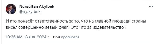 «Сегодня уже глава государства опубликовал фото нового флага, который и был утвержден им и парламентом. А между тем в стране неделю висел флаг, который не был принят парламентом и не был подписан президентом. Руководитель информационного отдела администрации главы государства нагло врал на всю республику и утверждал, что флаг другой. Сможете ли вы принять меры в отношении тех, кто изготовил и вывесил на главную площадь страны несуществующий флаг? Сможете ли вы привлечь к ответственности тех, кто на всю республику врал про флаг? Или перед законом не все равны? А между спортсменами и высокопоставленными госслужащими большая разница?» — обратился Темирлан Султанбеков.