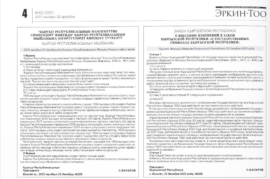 Закон о новом флаге Кыргызстана подписал президент. Он принят Жогорку Кенешем 20 декабря 2023 года. Инициаторами стали торага парламента Нурланбек Шакиев и депутат Улан Примов. На флаге изменили форму лучей из волнообразных на прямые.