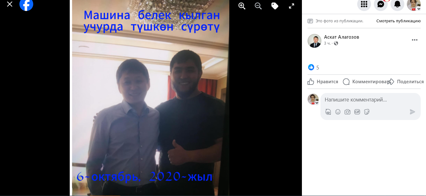 На снимке написано, что фото сделано во время вручения подарка — автомобиля — 6 октября 2020 года.