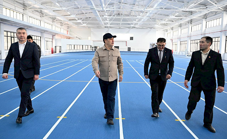 Садыр Жапаров осмотрел футбольно-легкоатлетический манеж, в котором была проведена капитальная реконструкция. Обновлена система отопления, вентиляции, установлены новые окна, дополнительное освещение, а также заново проложены канализационные сети. Во всех помещениях проведен капитальный ремонт с утеплением стен и крыши. В тренировочных залах установлены душевые кабины, туалеты. В зале для вольной борьбы обновлены спортивные маты. Их площадь теперь в два раза больше. Помещение для настольного тенниса стало отдельным залом с витражными окнами.