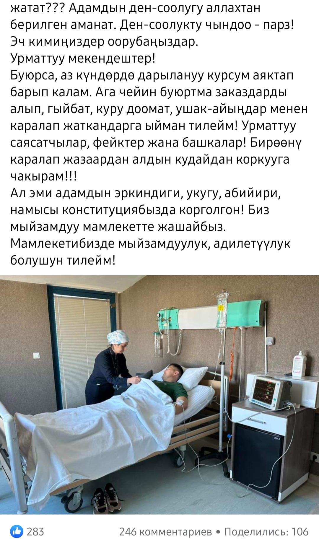 «Я написал письмо торага в рамках закона и приехал на лечение. Депутат Айбек Осмонов выехал спустя несколько дней с семьей. Между нашими вылетами разница в несколько дней. И вообще, кто делает политику из здоровья?» — говорится в тексте поста.
