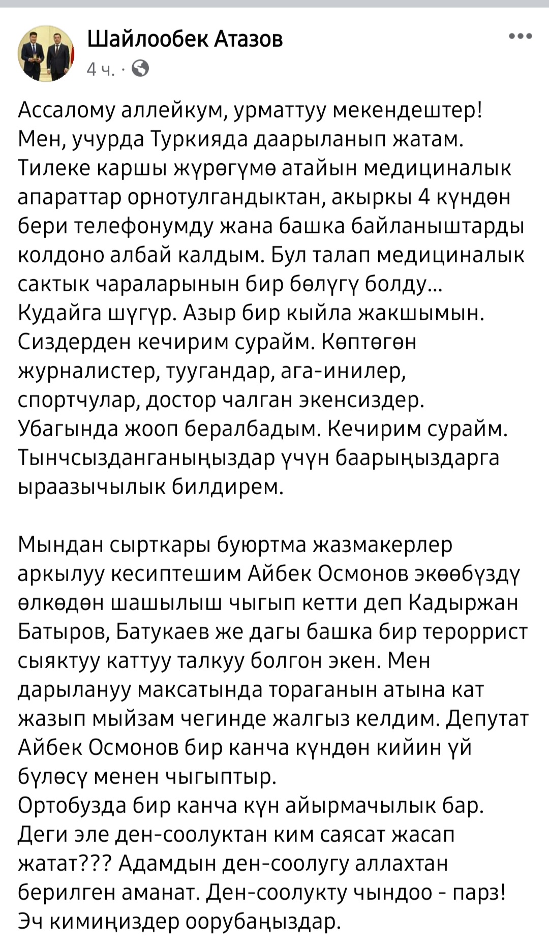 Депутат Жогорку Кенеша Шайлообек Атазов на своей странице в Facebook опубликовал обращение. Как выяснилось, он находится в турецкой больнице.