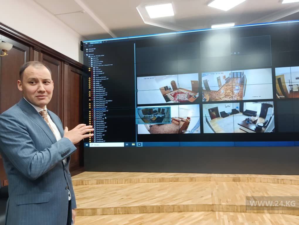 Начальник управления контроля исполнения решений главы государства и кабинета министров администрации президента Азамат Осмонов показал на большом экране трансляцию с камер видеонаблюдения из приемных руководителей госорганов.