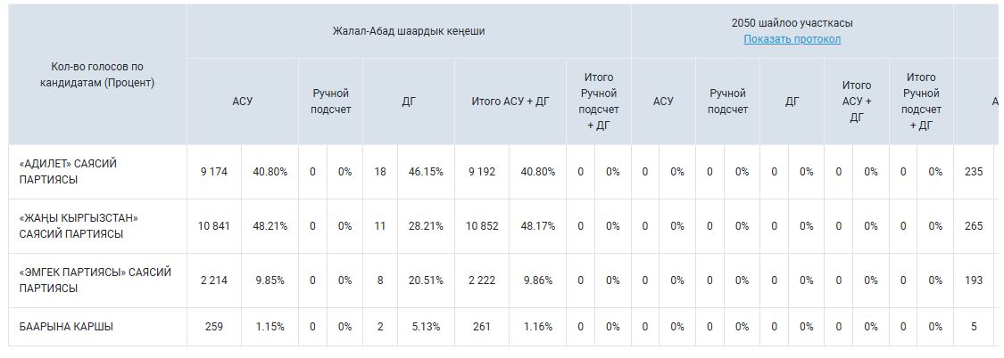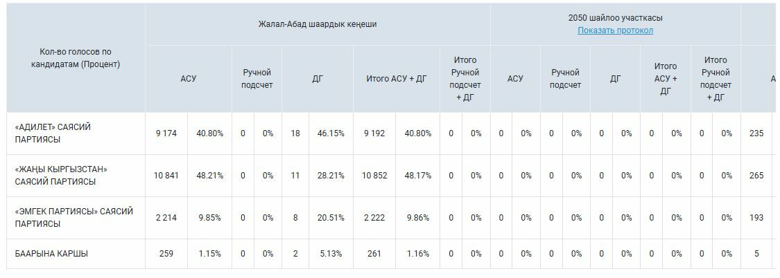 По предварительным подсчетам АСУ (91,67 процента), в Джалал-Абаде больше всех голосов набрала партия «Жаны Кыргызстан». За нее проголосовали 10 тысяч 841 избиратель. Это 48,21 процента от общего числа голосовавших.