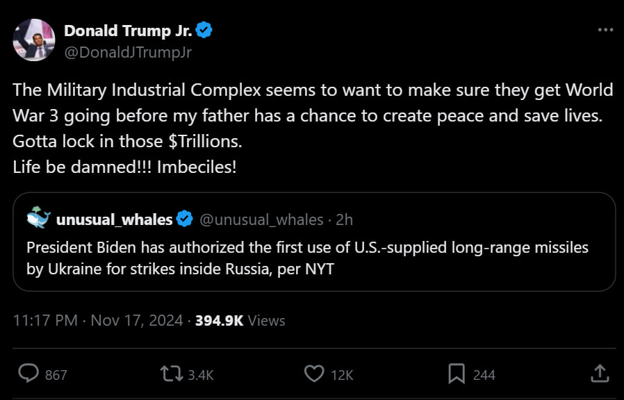 Дональд Трамп-младший уже назвал «имбецилами» лидеров стран, которые разрешили Украине дальнобойное оружие.