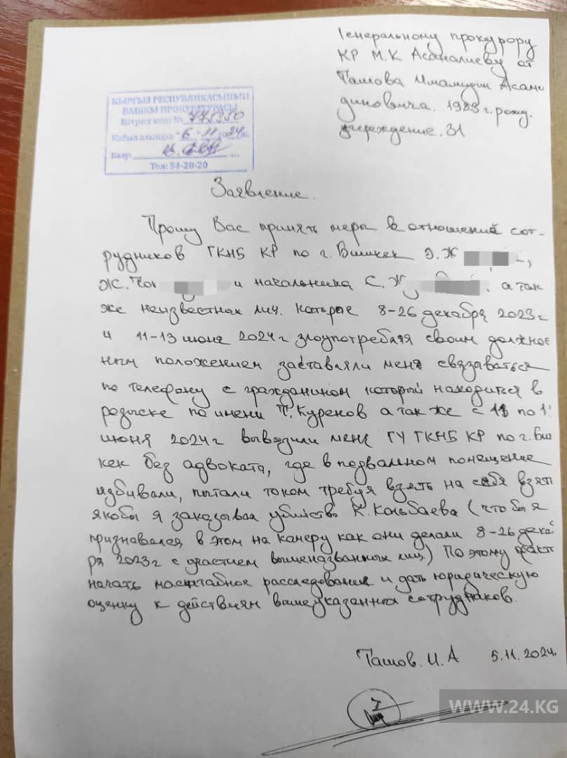 Напомним, 5 ноября бизнесмен Имамидин Ташов обратился к генеральному прокурору Максату Асаналиеву с просьбой принять меры в отношении сотрудников ГКНБ Э.Ж. и Ж.Ч. и их начальника С.Ж. По его словам, эти люди заставили связаться по телефону с активистом Тилекматом Куреновым, который находится в розыске. Бизнесмен также добавил, что сотрудники спецслужб якобы в подвале ГУ ГКНБ по Бишкеку избивали, пытали током, требуя признаться в том, что заказал убийство вора в законе Камчи Кольбаева.