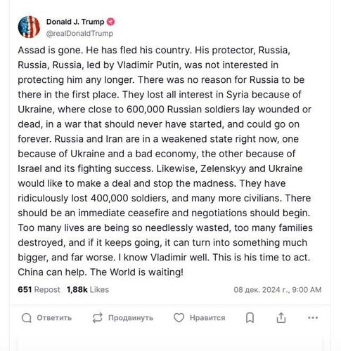 По его словам, Асада больше нет, он бежал из своей страны, Россия больше не заинтересована в поддержке Асада. Трамп призвал начать переговоры с Украиной.