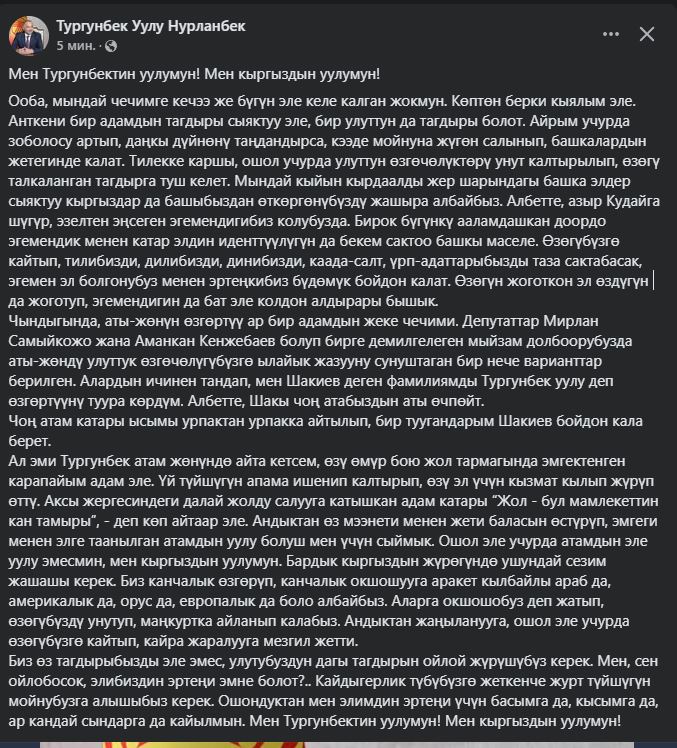 Спикер Жогорку Кенеша Нурланбек Шакиев сменил фамилию, и в связи с этим он сделал обращение в социальных сетях.