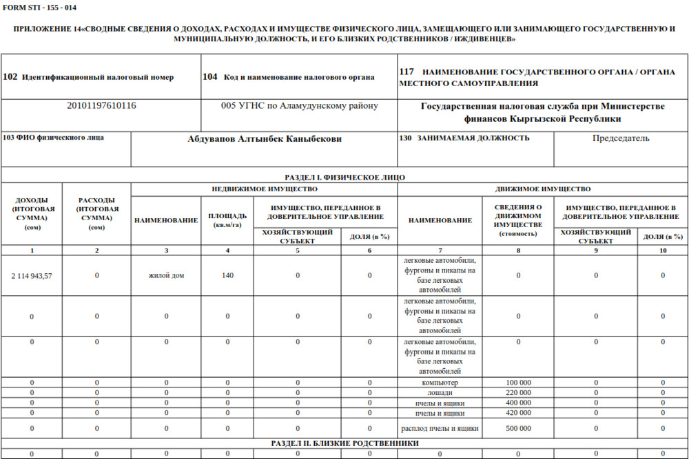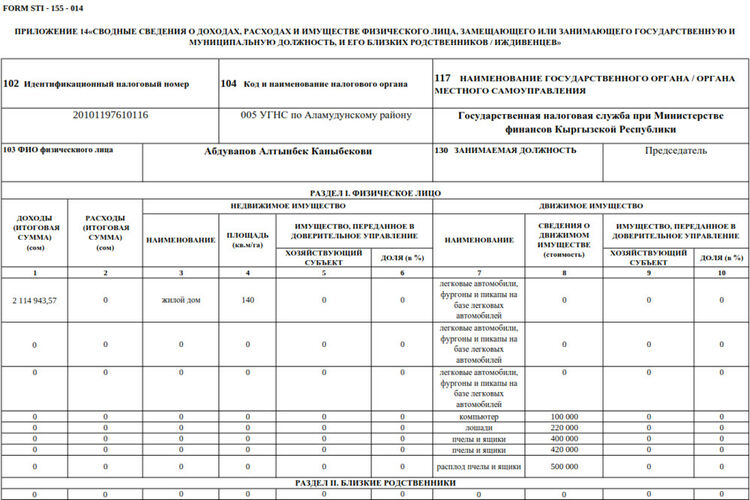 Согласно отчету, чиновник заработал за указанный период 2 миллиона 114 тысяч 943,57 сома. В декларации он указал, что владеет жилым домом площадью 140 квадратных метров и тремя автомобилями.