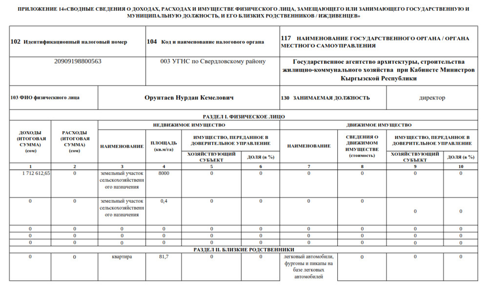 Согласно отчету, он заработал 1 миллион 712 тысяч 612 сомов. О свои расходах чиновник не сообщил.