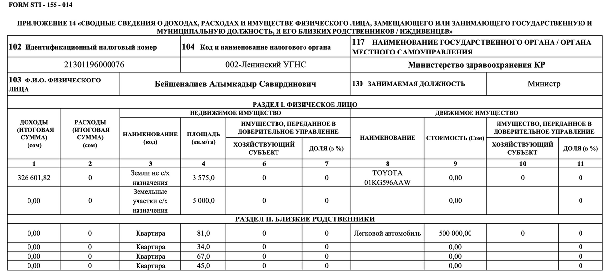 Согласно отчету, глава Минздрава за указанный период имел доход размером 326 тысяч 601 сом. Это самая маленькая сумма заработанного из всех членов кабинета министров, сдавших декларации. Отчет, очевидно, предоставлен за период с 13 сентября 2023-го, когда Алымкадыр Бейшеналиев вновь возглавил профильное ведомство.