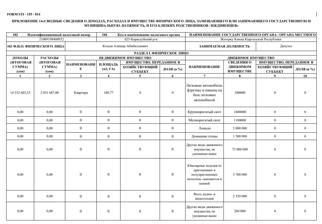 Безоговорочным лидером по доходам оказался экс-депутат Жогорку Кенеша Жусупбек Коргонбай уулу, он задекларировал 72 миллиона сомов и расходы на сумму 18 миллионов сомов. В его собственности земельные участки общей площадью 2 тысячи 890 квадратных метров, жилой дом площадью 23 квадратных метра и ценные бумаги.