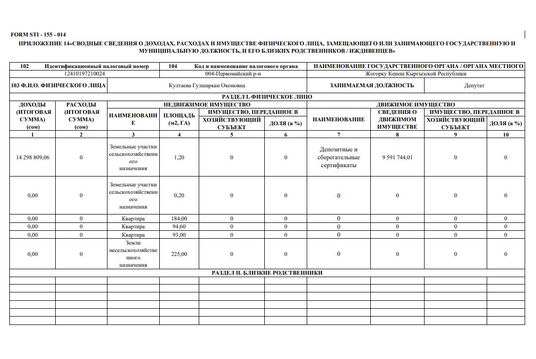 Депутат Гулшаркан Култаева задекларировала доход в размере 14,3 миллиона сомов. Ей принадлежат земельные участки сельскохозяйственного назначения общей площадью 1,4 гектара, три квартиры общей площадью 372 квадратных метров, а также земельный участок несельскохозяйственного назначения площадью 225 квадратных метров. В декларации указаны депозитные и сберегательные сертификаты на сумму 10 миллионов сомов. Замыкает список ныне экс-председатель Национального банка КР Кубанычбек Боконтаев, который задекларировал доход в размере 13 миллионов сомов и расходы в размере 830 тысяч сомов. В его собственности земельные участки сельскохозяйственного назначения общей площадью 2,6 гектара, два дома общей площадью 116 квадратных метров и ценные бумаги.