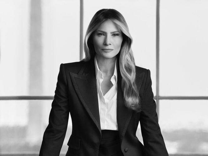 Как пишет WWD, на черно-белом снимке 54-летняя Мелания Трамп позирует в черном брючном костюме Dolce & Gabbana, сшитом на манер мужского смокинга, и белой рубашке. Образ дополнил пояс-кушак Ralph Lauren. Первая леди стоит за столом в Желтом овальном кабинете, опершись на него руками. Позади нее — панорамное окно с видом на монумент Вашингтону — мраморно-гранитный обелиск высотой 169 метров, самый большой обелиск в мире и самое высокое сооружение в Вашингтоне.