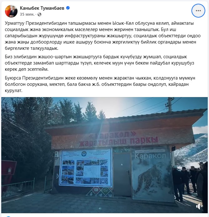 «В ходе рабочей поездки мы обсудили с местными органами власти вопросы улучшения инфраструктуры, ремонта социальных объектов и реализации новых проектов. Считаю, что мы должны приложить все усилия для улучшения условий жизни нашего народа, создать современные условия в социальных учреждениях и заложить прочный фундамент для будущих поколений», — написал Каныбек Туманбаев.