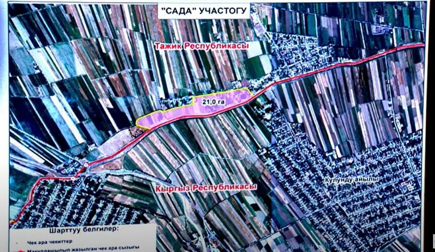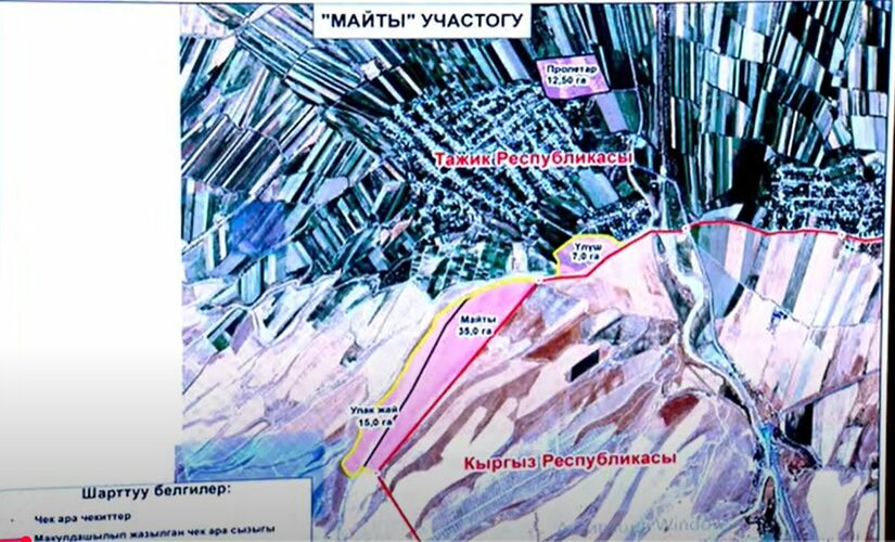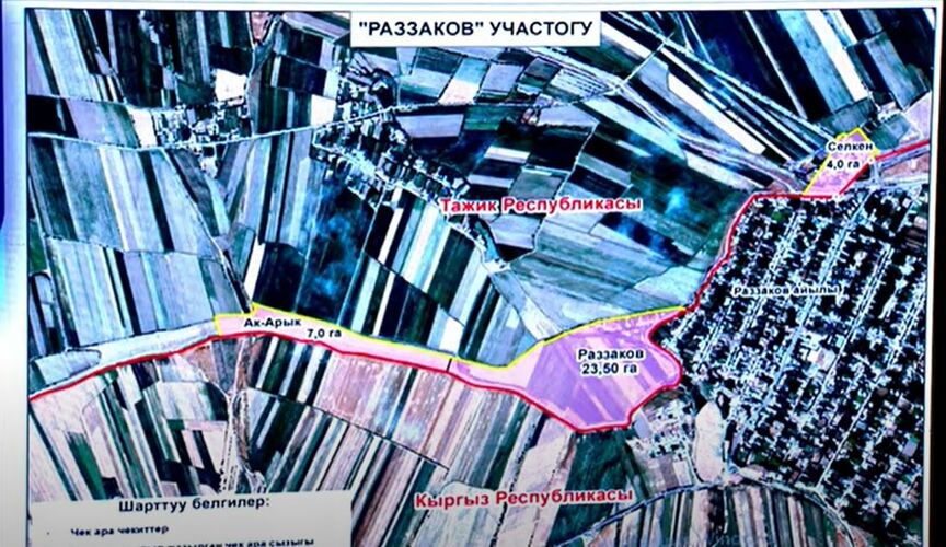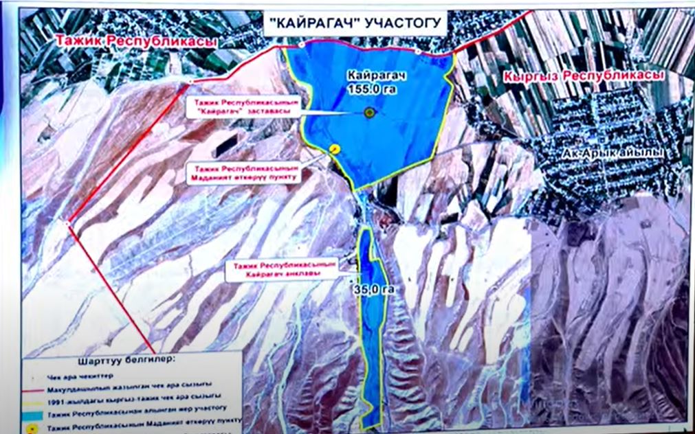 «В Лейлекском районе мы взяли участок Кайрагач — 155 гектаров, 35 гектаров анклава Кайрагач. Баткенские депутаты хорошо знают эту местность. Вот это все было таджикской землей — 155 гектаров, а вот эти 35 гектаров — были анклавом. Таджики считали это своей землей. Конечно, документально это не было закреплено, но мы морально с этим соглашались, что и 155 гектаров, и 35 гектаров — их земля, там была их застава, они контролировали территорию. Там есть село, около 10 домов, где живут кыргызы, но получилось, что территорию контролировали соседи», — сказал Ташиев.