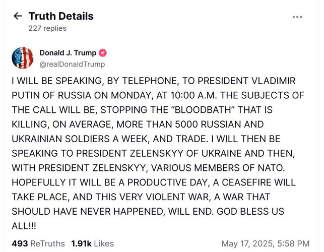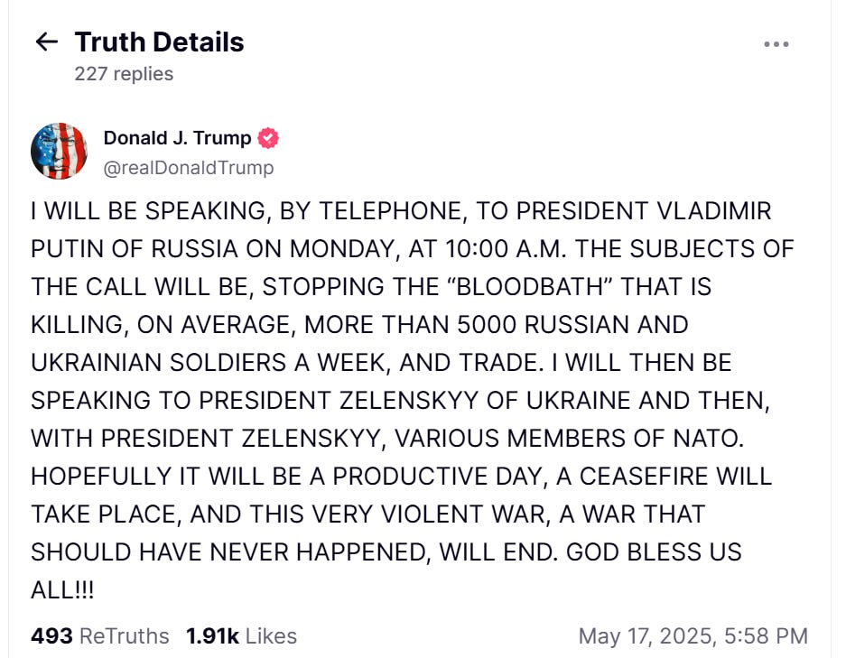 «...Я буду говорить по телефону в понедельник с президентом России Владимиром Путиным. Темами разговора будут прекращение «кровопролития», которое убивает в среднем более 5 тысяч российских и украинских солдат в неделю, и торговля», — говорится в сообщении.