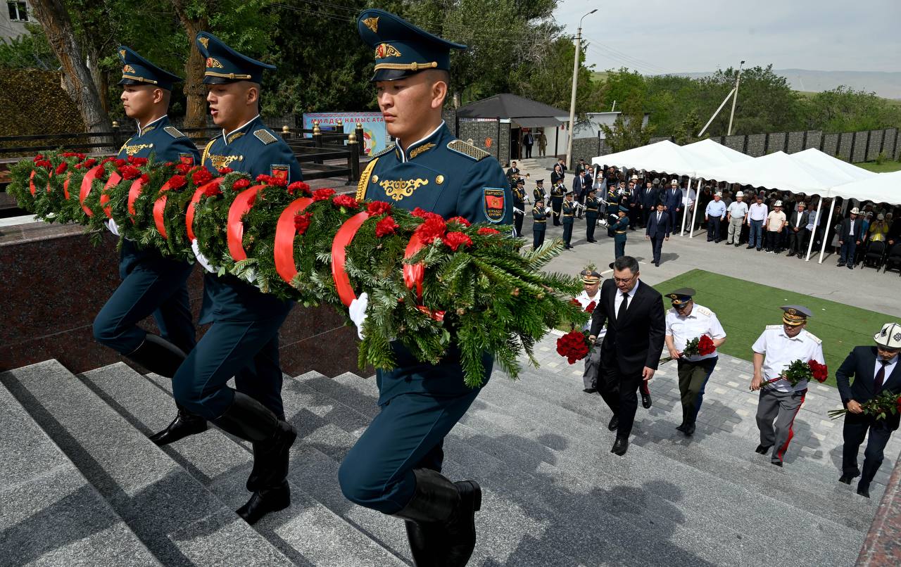 Президент Садыр Жапаров сегодня в Национальном историко-мемориальном комплексе «Ата-Бейит» принял участие в церемонии открытия памятника военнослужащим, погибшим при защите государственной границы.