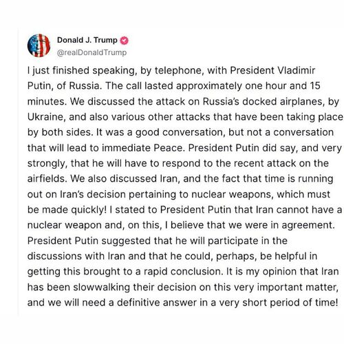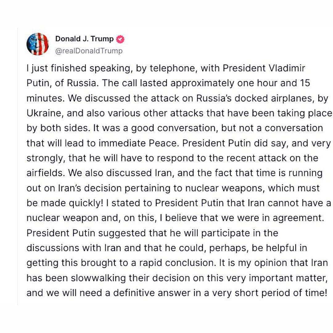 «Я только что закончил разговор по телефону с президентом России Владимиром Путиным. Разговор длился примерно один час и 15 минут. Мы обсудили нападение Украины на самолеты России, а также различные другие атаки, которые происходят с обеих сторон. Это был хороший разговор, но не тот разговор, который приведет к немедленному миру. Президент Путин действительно сказал, и очень решительно, что ему придется ответить на недавнюю атаку на аэродромы.