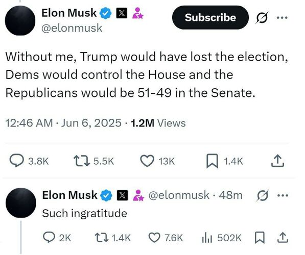 «Без меня Трамп проиграл бы выборы, демократы контролировали бы Палату представителей, а республиканцы имели бы 51-49 в Сенате. Какая неблагодарность», — написал он в соцсети X в ответ на заявление Дональда Трампа, сказавшего, что «очень разочарован» им.