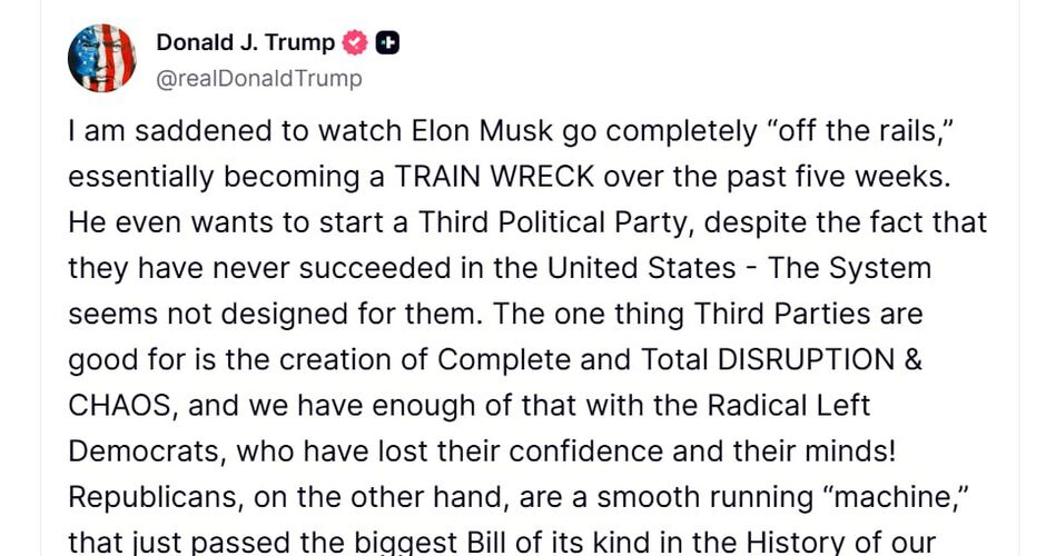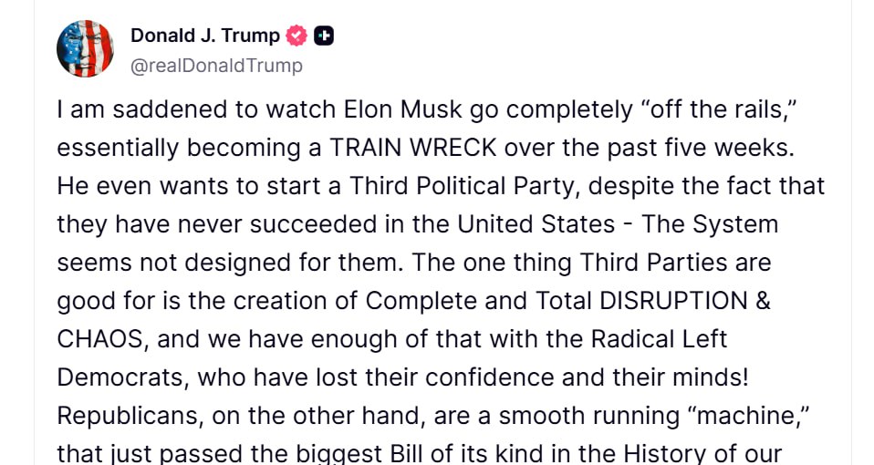 «Мне грустно при виде Илона Маска, который полностью слетел с катушек... Он даже хочет создать третью партию, несмотря на тот факт, что они никогда не добивались успеха в Соединенных Штатах — Система, похоже, на них не рассчитана», — написал глава Белого дома в своей соцсети Truth Social.