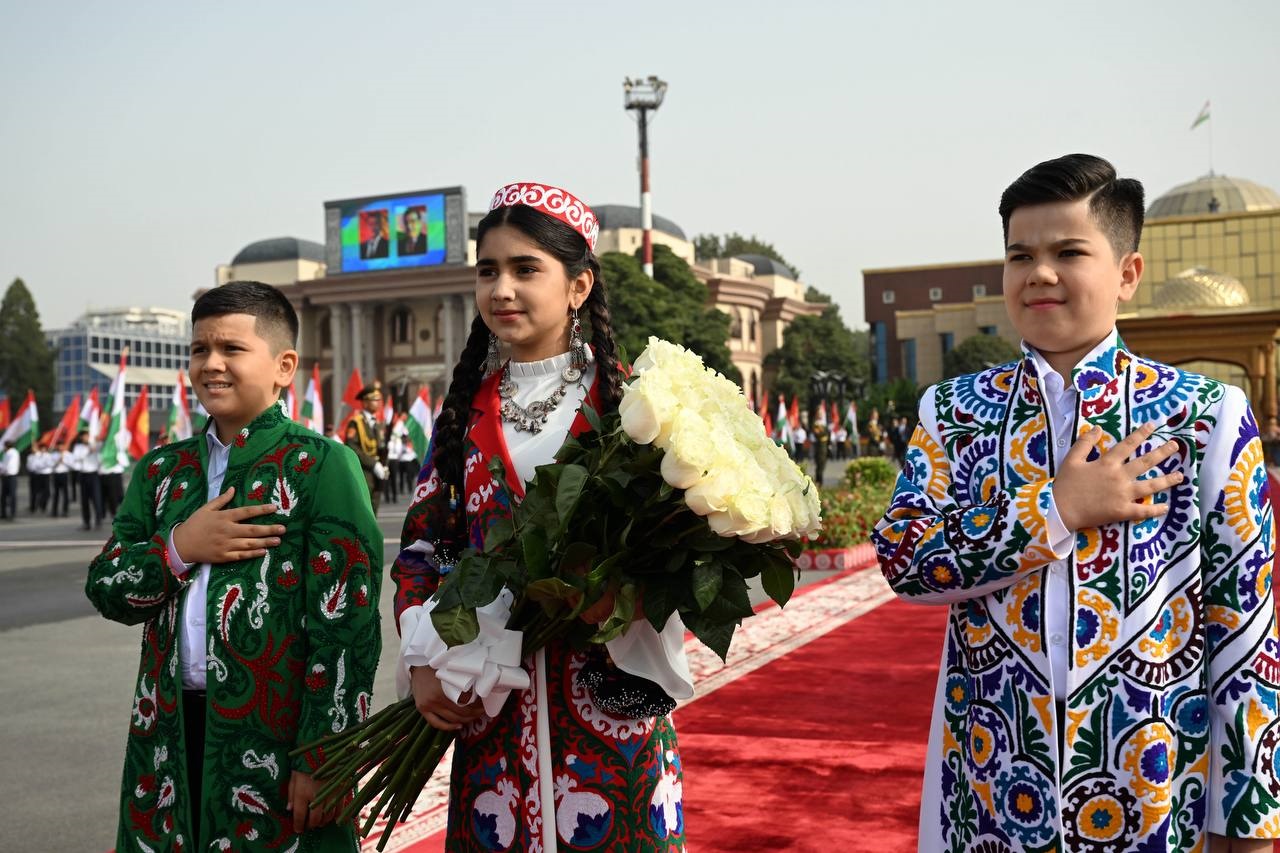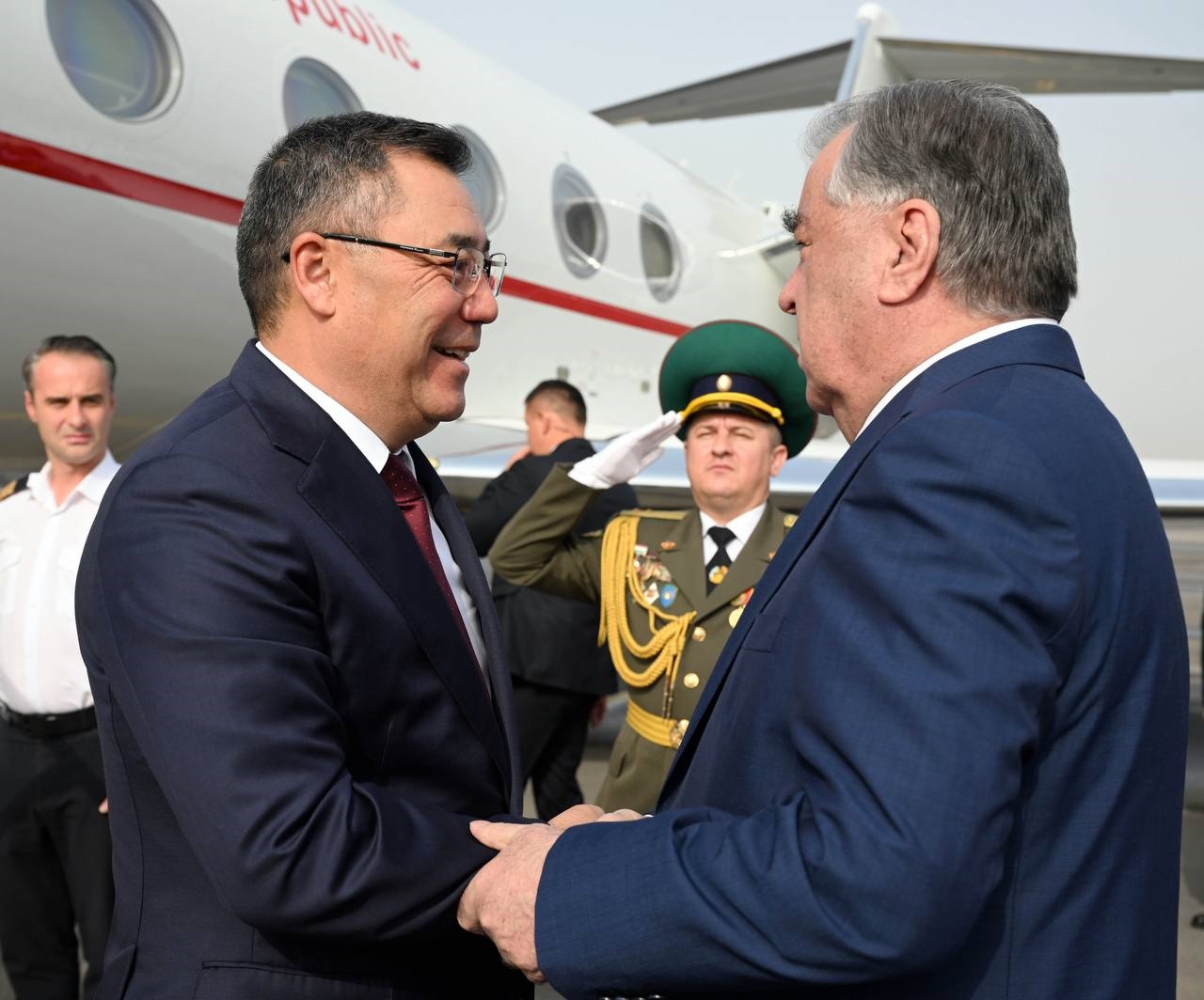Президента Садыра Жапарова встретил глава Таджикистана Эмомали Рахмон. В международном аэропорту города Душанбе вывешены государственные флаги двух стран, расстелена ковровая дорожка, выстроен почетный караул.