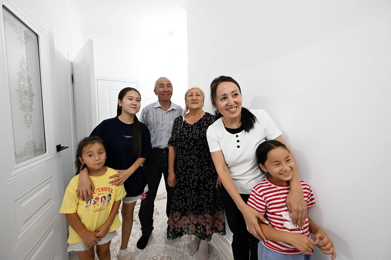 В завершение своей речи глава государства вручил ключи от новой квартиры жительнице Бишкека Астре Асанакуновой — матери трех детей, которая стояла в очереди на получение жилья 4 года.