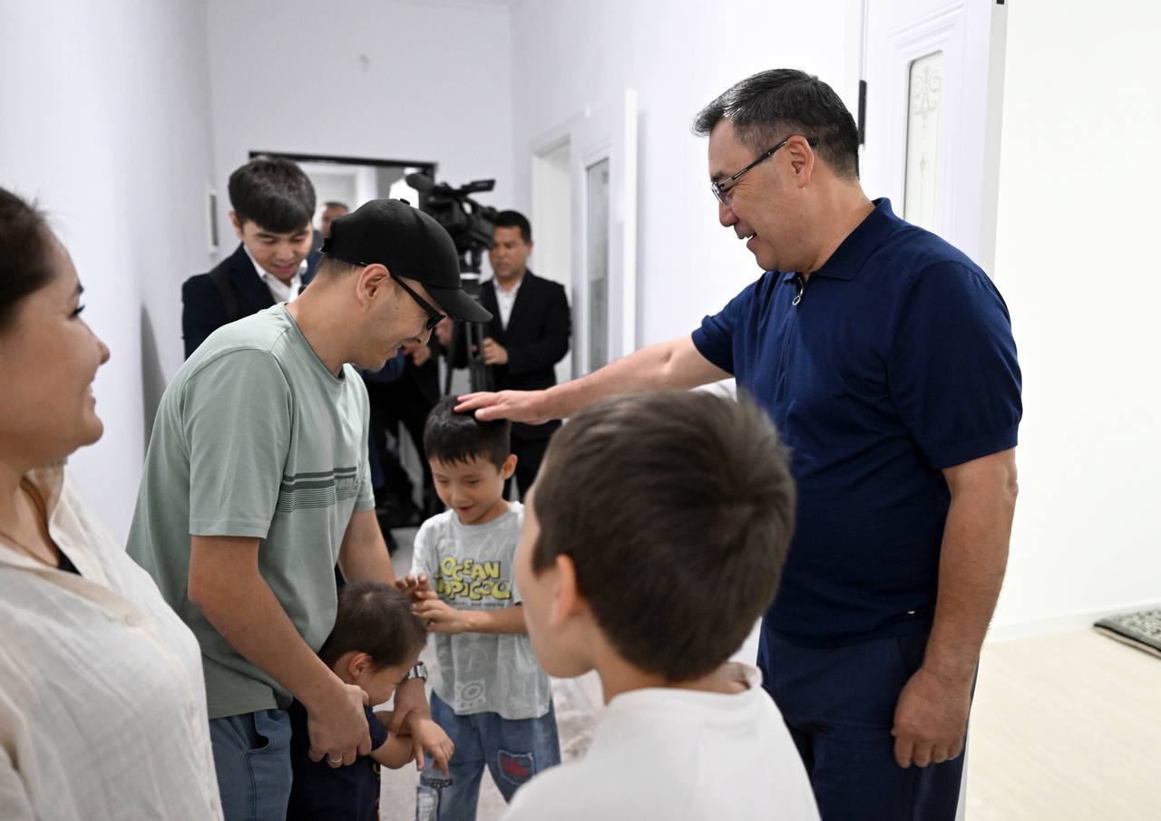 Садыр Жапаров осмотрел новые квартиры, побеседовал с новоселами и пожелал им, чтобы новые дома стали местом уюта, тепла и семейного благополучия.