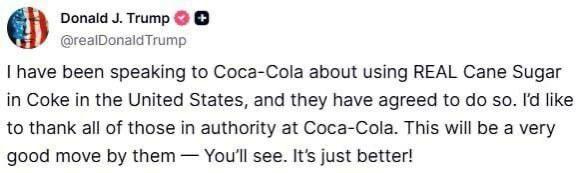 Президент США Дональд Трамп предложил компании Coca-Cola использовать в качестве подсластителя газировки тростниковый сахар вместо кукурузного сиропа. «Это будет очень хороший ход с их стороны — вот увидите. Так будет лучше!» — написал президент США в соцсетях. Об этом сообщает DW.